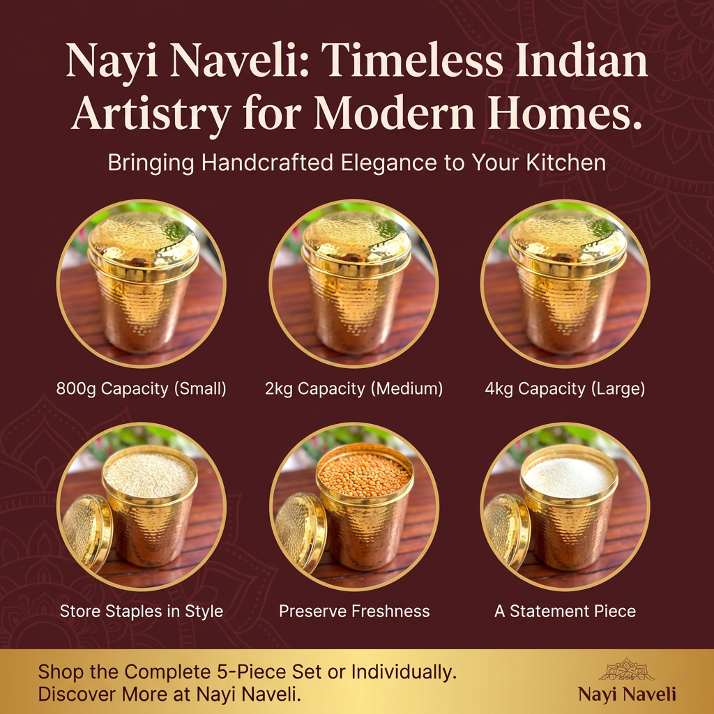 Bring timeless elegance and functionality to your kitchen with this exquisite set of 5 hand-hammered brass containers, crafted with love in India. Perfect for storing staples like rice, atta, dals, sugar, and more, these containers are not just storage—they’re statement pieces.