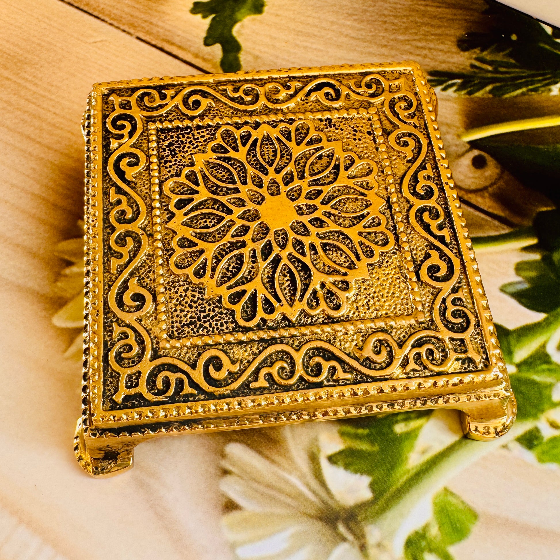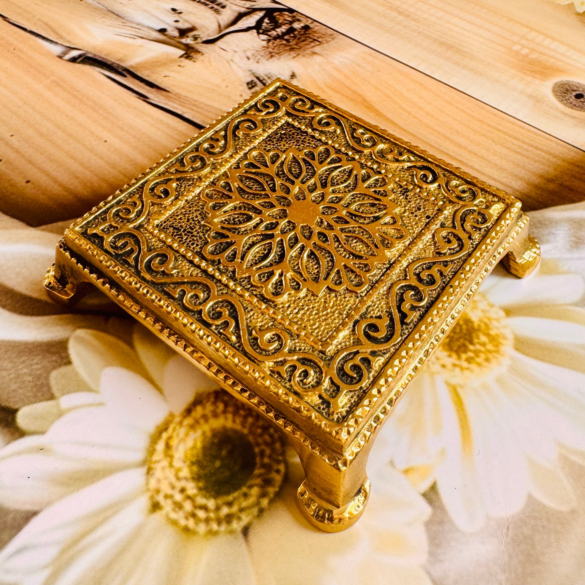 Each asana is handcrafted from 100% pure brass, offering sturdiness, shine, and spiritual elegance. These mini chowkis are perfect for placing idols, diyas, kalash, or any sacred puja element. Their antique finish adds a regal charm, making them ideal for festive décor, rituals, or gifting.