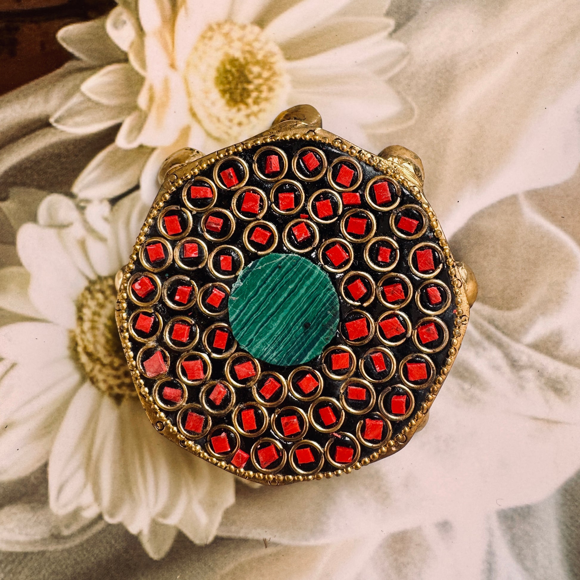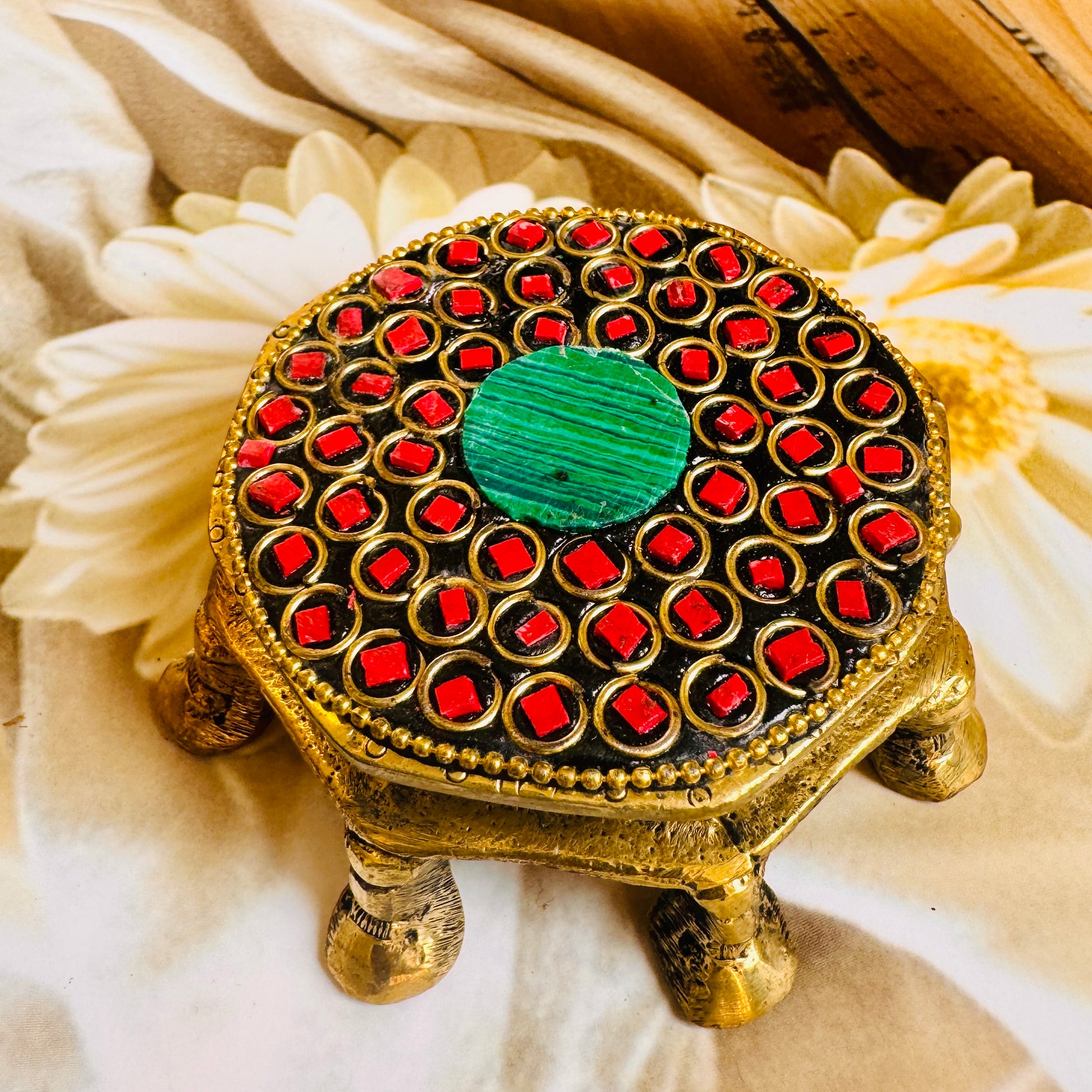 - Gemstone-Studded Round Asana (Weight: 300g, Diameter: 7cm, Height: 3.5cm) – adorned with red and green stones for a royal temple look.